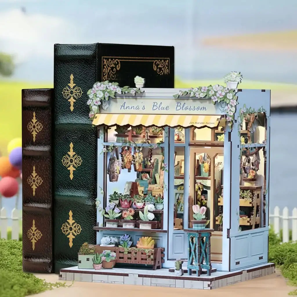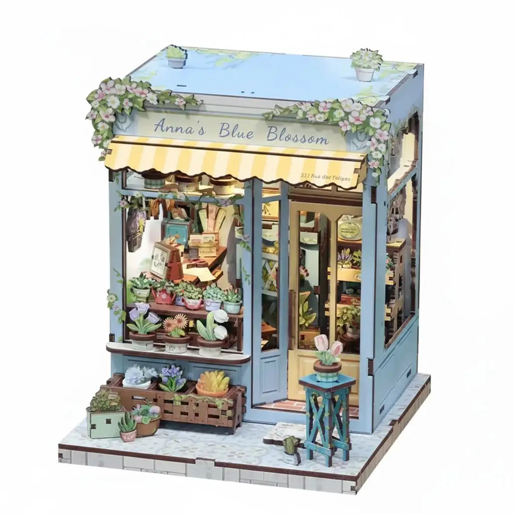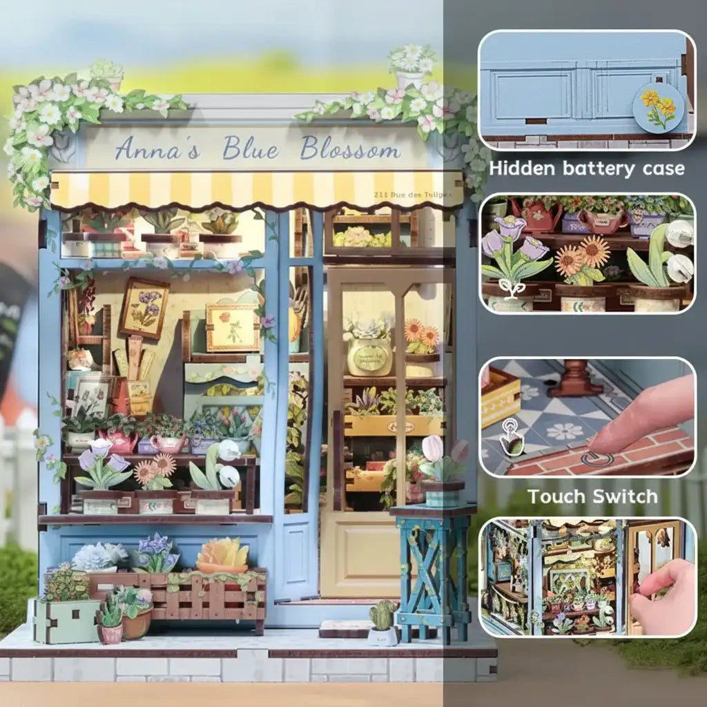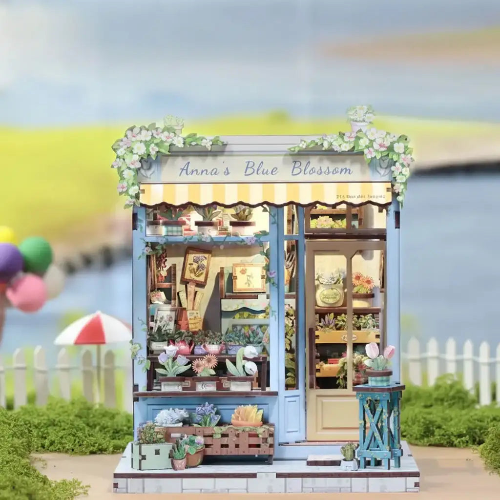 Exquisite Flower Shop Miniature House Kit - On a street corner, Anna's Blue Blossom rests quietly. Staggered flower stands, holding clusters of gently blooming plants. Wind-whipped curtains release fresh floral fragrance, making passersby instinctively slow down. More than a flower shop, this book nook feels like an extension of the quiet nook in everyone's heart. Approach, and the city's noise gradually recedes.
