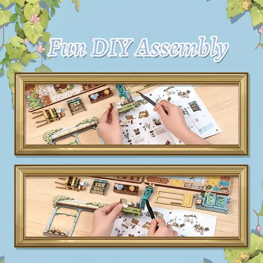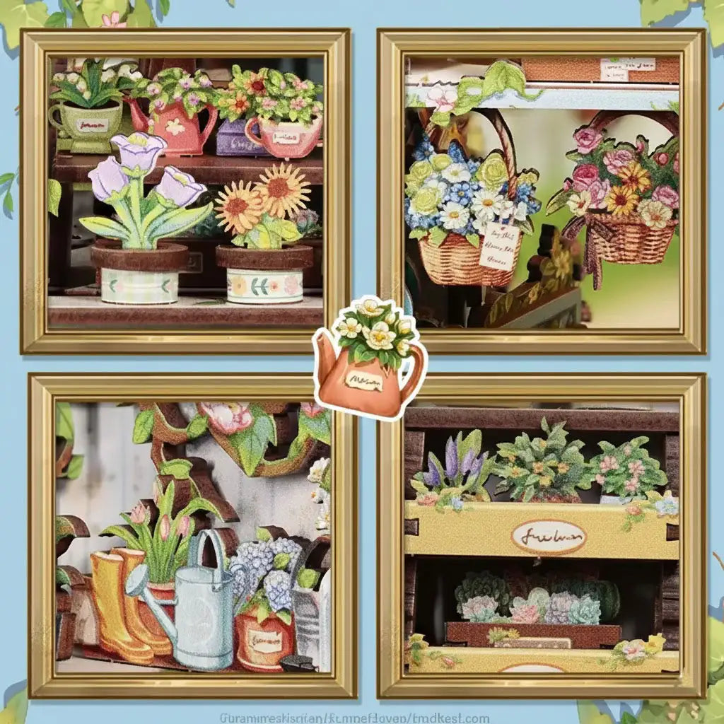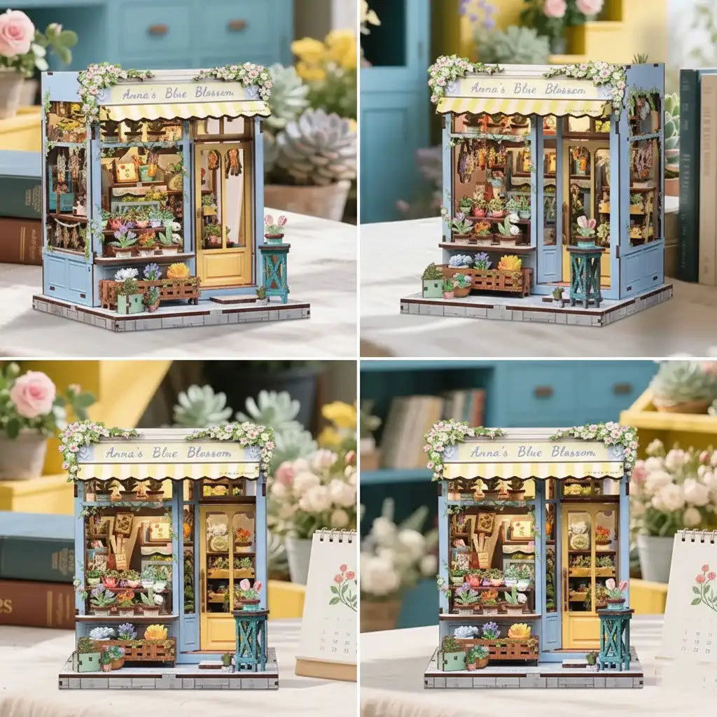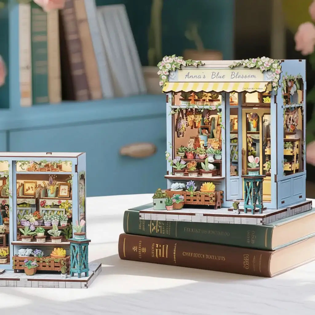 Exquisite Flower Shop Miniature House Kit - On a street corner, Anna's Blue Blossom rests quietly. Staggered flower stands, holding clusters of gently blooming plants. Wind-whipped curtains release fresh floral fragrance, making passersby instinctively slow down. More than a flower shop, this book nook feels like an extension of the quiet nook in everyone's heart. Approach, and the city's noise gradually recedes.