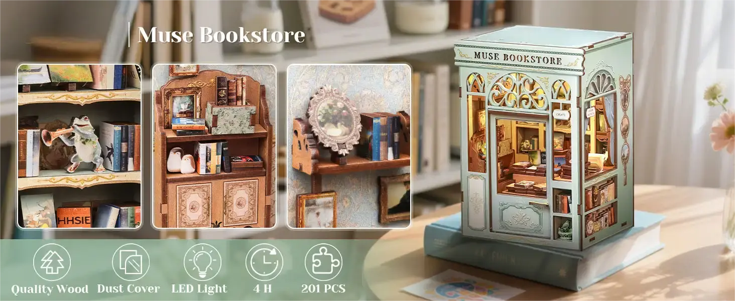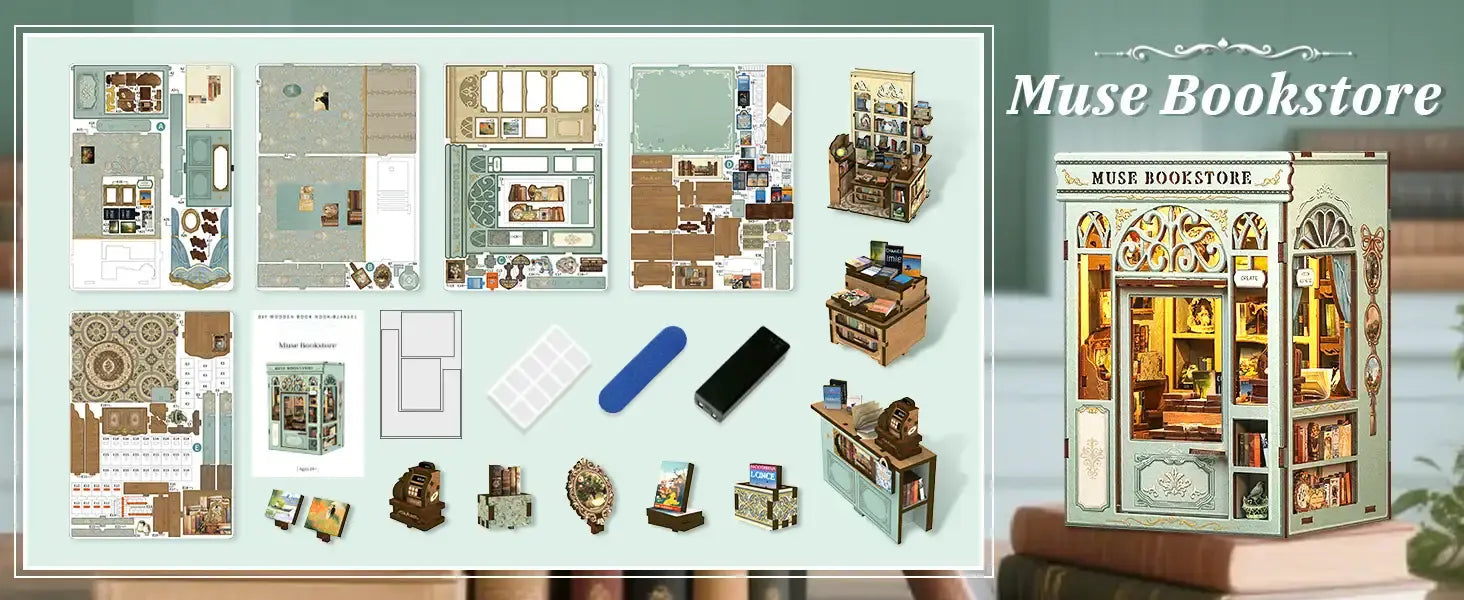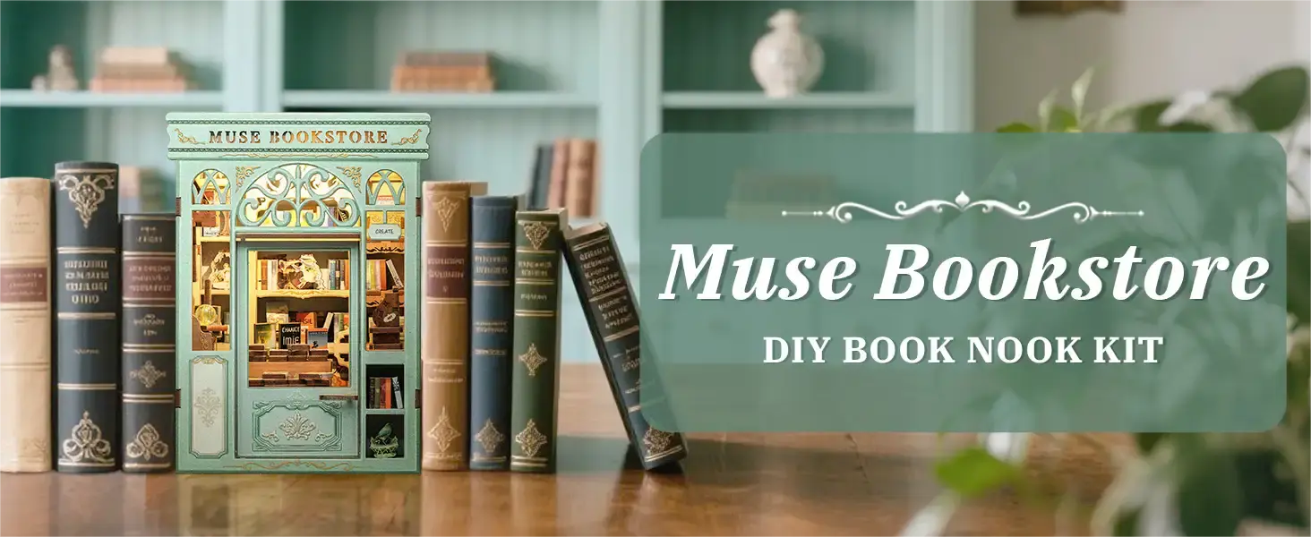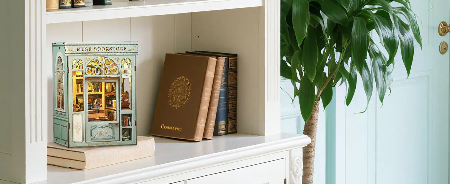 Unveil your creativity with the DIY Book Nook Muse Bookstore from the Mini Book House Series. This wooden miniature house kit invites you to craft a charming bookstore scene, complete with tiny shelves, warm lighting, and intricate details that bring your bookshelf to life.