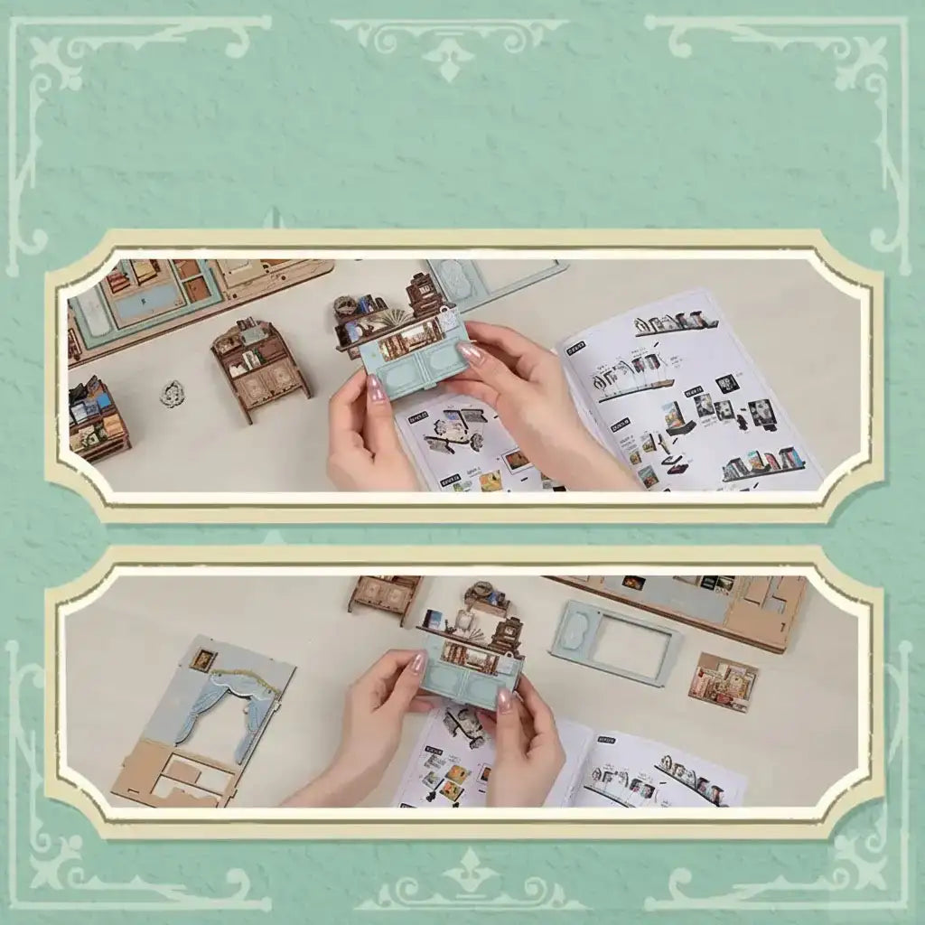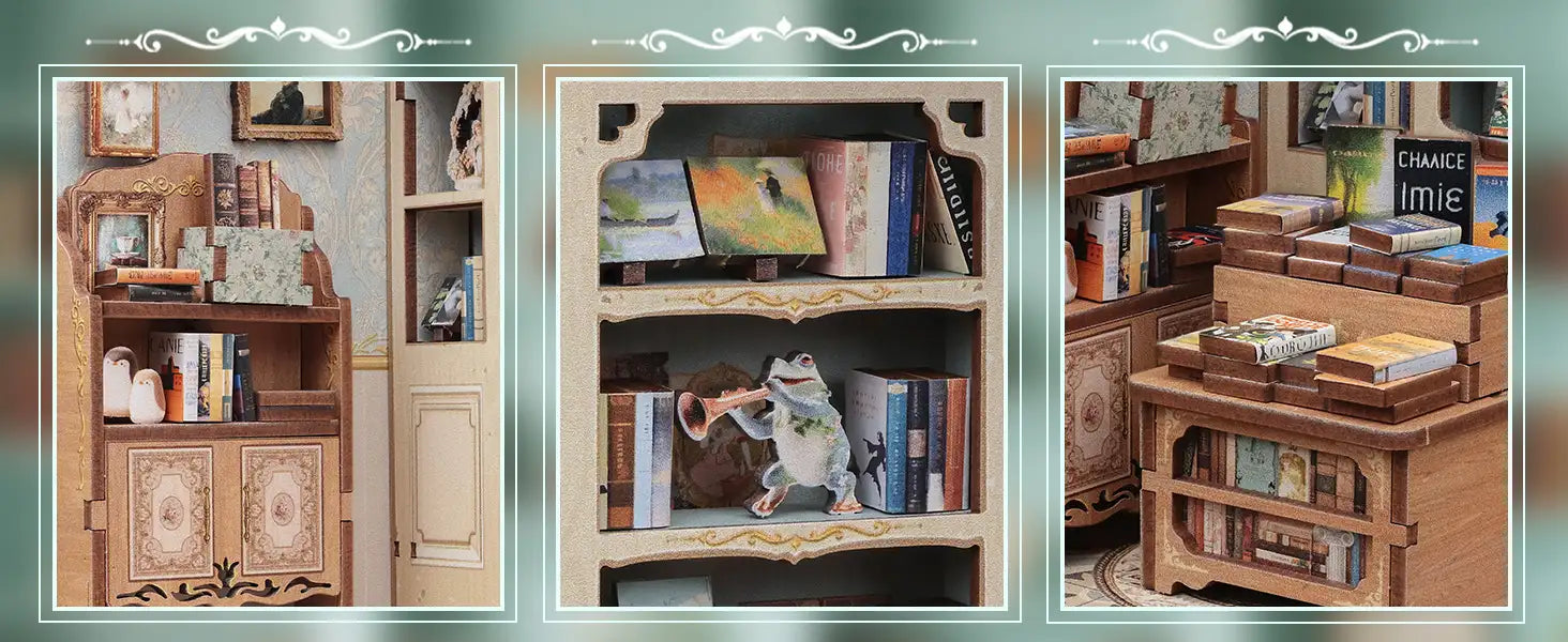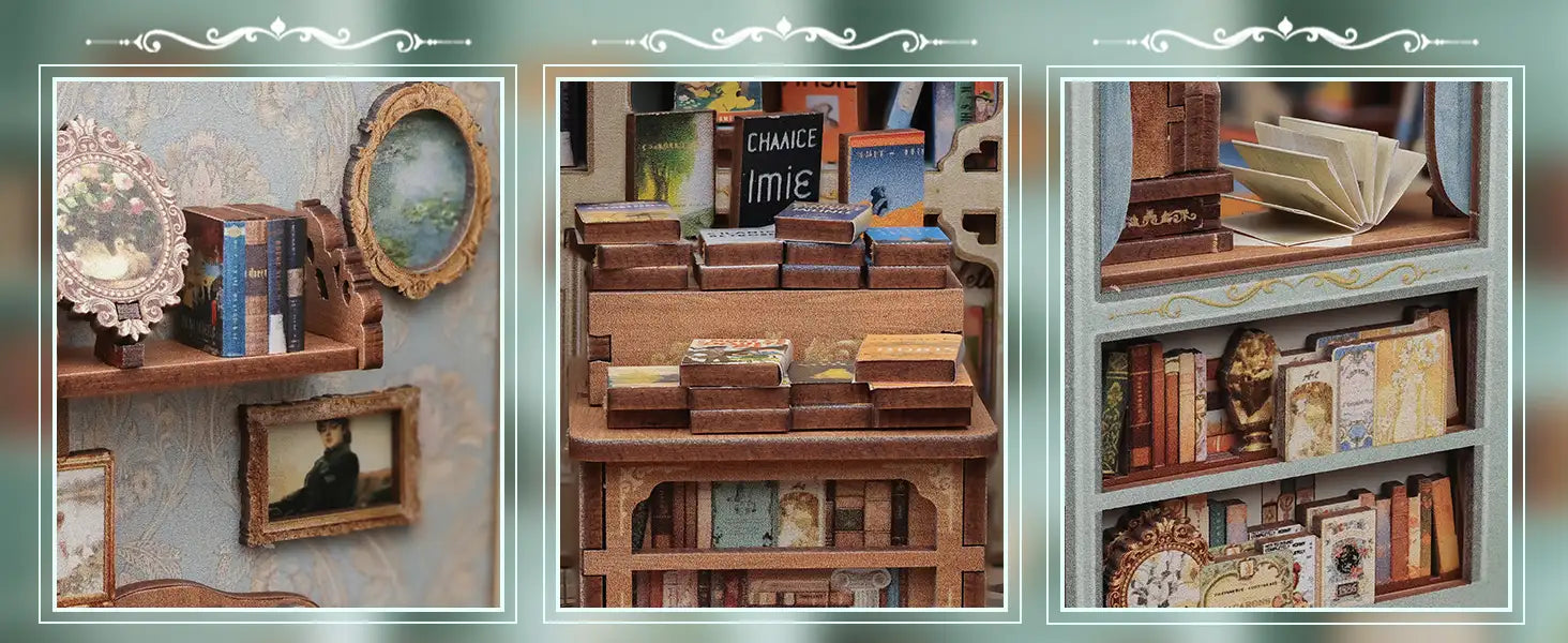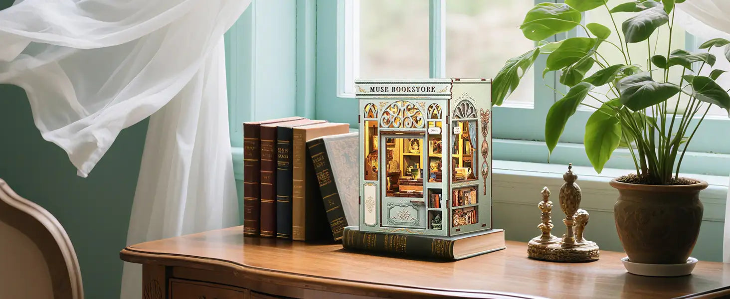 Unveil your creativity with the DIY Book Nook Muse Bookstore from the Mini Book House Series. This wooden miniature house kit invites you to craft a charming bookstore scene, complete with tiny shelves, warm lighting, and intricate details that bring your bookshelf to life.